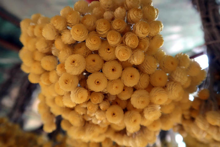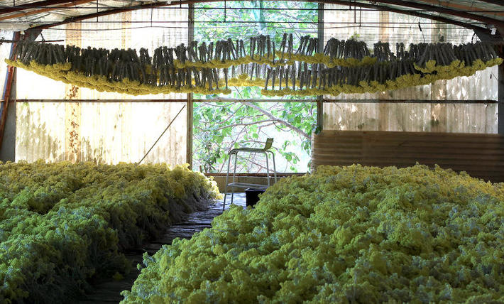 Elles sont ensuite ramassées pour confectionner des bouquets d'une dizaine de brins. Les bouquets sont suspendus la tête en bas dans les serres pour achever le séchage et les figer dans le temps.
