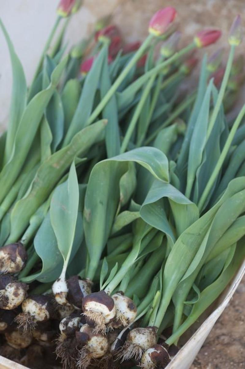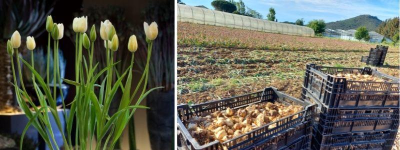 Récolte de la fleur de mars à mai : la tulipe coupée. Cette appellation fait référence à l’opération qui consiste à couper la fleur tout en laissant le bulbe en terre orné de quelques feuilles. On obtiendra ainsi la formation d’un nouveau bulbe. Arrachage au mois de juin