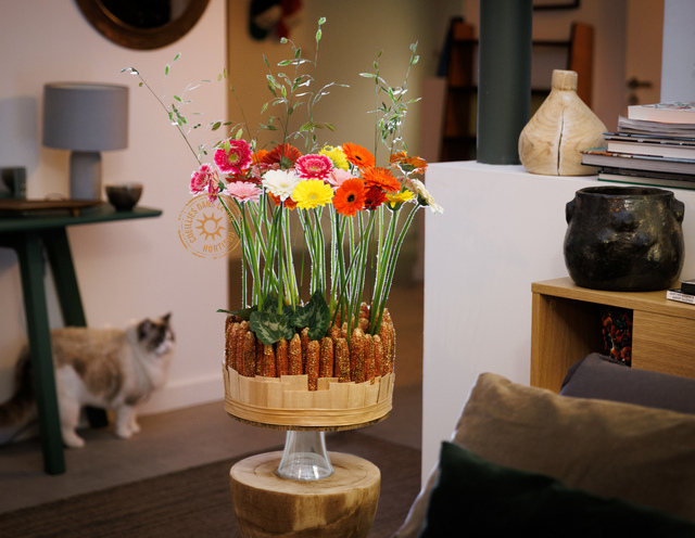 Une balade en campagne au cours de laquelle vous auriez pu glaner ces cœurs d'épis de maïs...quelle chance ! Vous trouverez bien comment vous en procurer même sans balade pour réaliser cette composition florale proposée par Stéphane Chanteloube, fleuriste Meilleur Ouvrier de France.