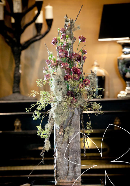 Après avoir placé la mousse dans le contenant, commencer la composition en plaçant les bois tout autour du contenant. Puis piquer les lisianthus au centre à diverses hauteurs. Réaliser les finitions avec l'eucalyptus