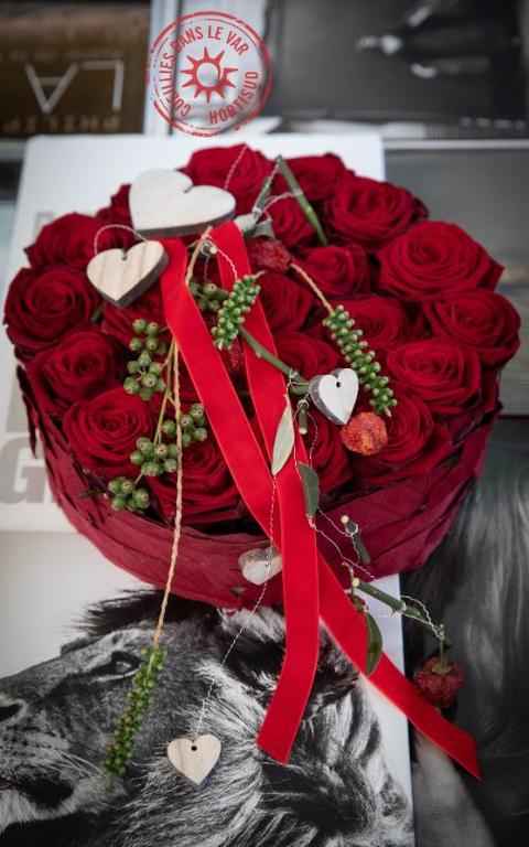 Une belle brassée de roses rouges, quelques morceaux de bois, du ruban... et tout un art pour en faire une composition florale à ravir son cœur ! Réalisation Stéphane Chanteloube, Meilleur Ouvrier de France 2019