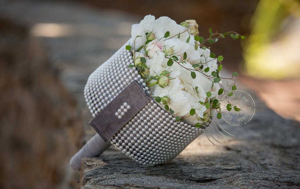 Charline Pritscaloff, Meilleur Ouvrier de France réalise un bouquet de mariée raffiné avec des pivoines du Var, ainsi que des roses Mimi Eden et un ornement perlé du plus bel effet...